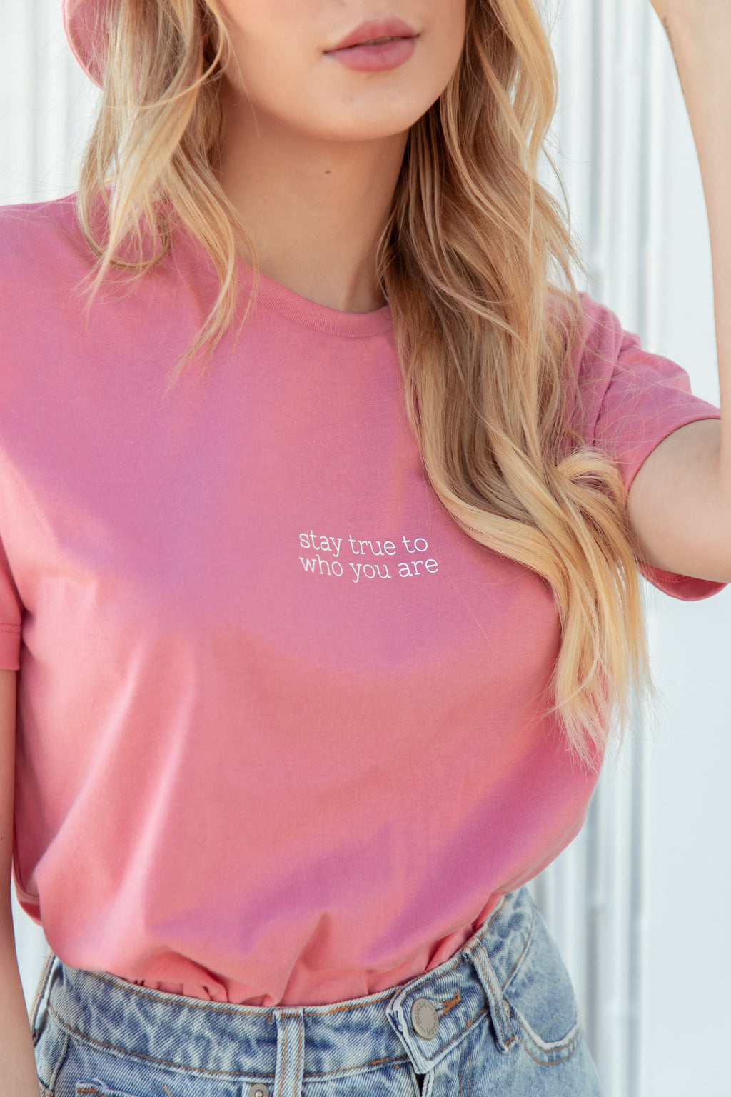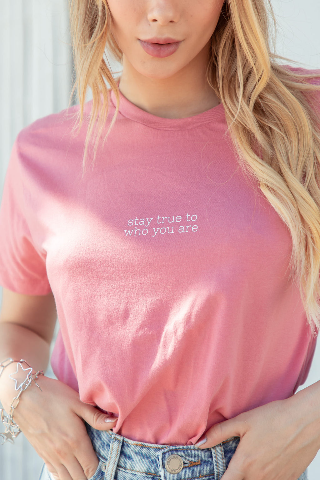 Camiseta com modelagem reta, decote redondo com gola de ribana canelada, acabamento de reforço de gola. Estampa frontal com escrita ''Stay true to who you are'' tradução para o português ''Permaneça fiel a quem você é''.