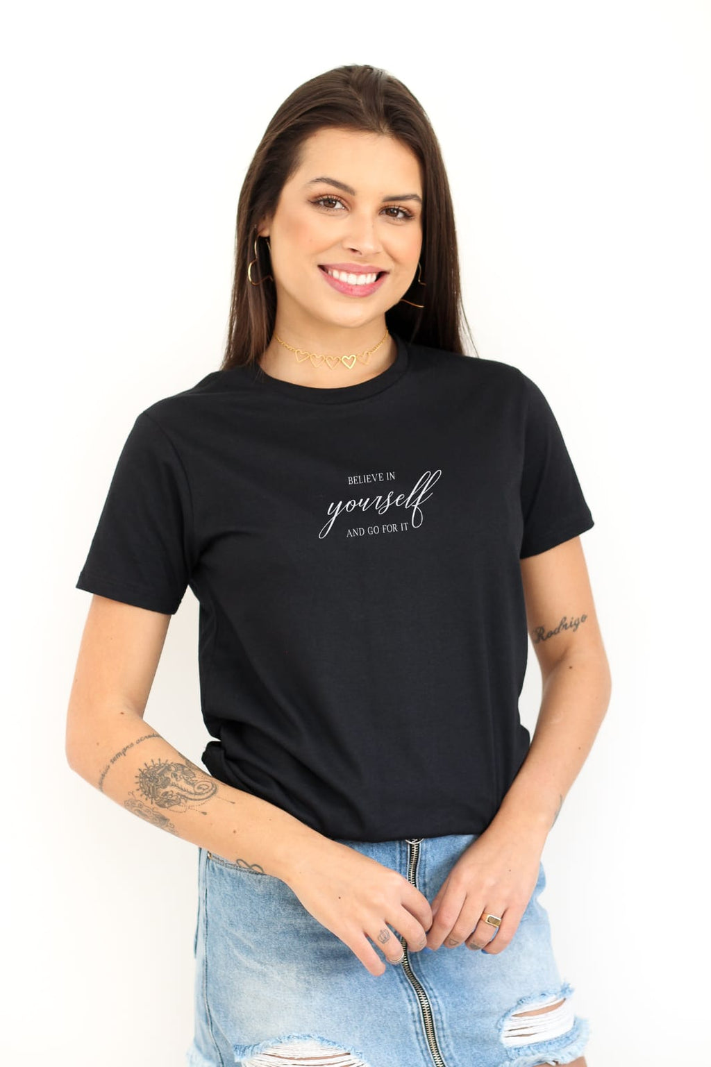Camiseta com modelagem reta, decote redondo com gola de ribana canelada, acabamento de reforço de gola. Estampa frontal com escrita ''Believe in yourself and go for it‘’ tradução para o português ‘’Acredite em você mesmo e vá em frente‘’.